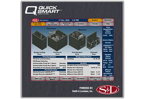 Delivering simplified operation yet powerful treatment system control, QUICKSMART™ Controls provide unparalleled ability to monitor and adjust all of your TITAN MBR™ functions. The easy to use, intuitive layout makes control modifications, screen navigation and viewing easier than ever, with screen function buttons and a status bar accesible from every screen. Added features take system controller functionality to new levels.