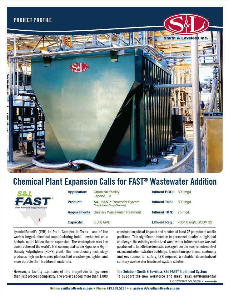 LyondellBasell’s (LYB) La Porte, Texas complex underwent a major expansion that included construction of a first-of-its-kind commercial-scale Hyperzone HDPE plant, significantly increasing onsite personnel. The growth created a challenge because existing centralized wastewater infrastructure could not accommodate domestic sewage from new remote facilities and administrative buildings. To maintain operational continuity and environmental compliance, a decentralized sanitary wastewater treatment solution was required. Smith & Loveless provided an S&L FAST® Treatment System with a 5,500 GPD capacity to effectively treat wastewater and support the expanded workforce.