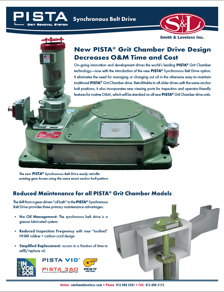 On-going innovation and development drives the world’s leading PISTA® Grit Chamber technology—now with the introduction of the new PISTA® Synchronous Belt Drive option. It eliminates the need for managing or changing out oil in the otherwise easy-to-maintain traditional PISTA® Grit Chamber drive. Retrofittable to all older drives with the same anchor bolt positions, it also incorporates new viewing ports for inspection and operator-friendly features for routine O&M, which will be standard on all new PISTA® Grit Chamber drive units.